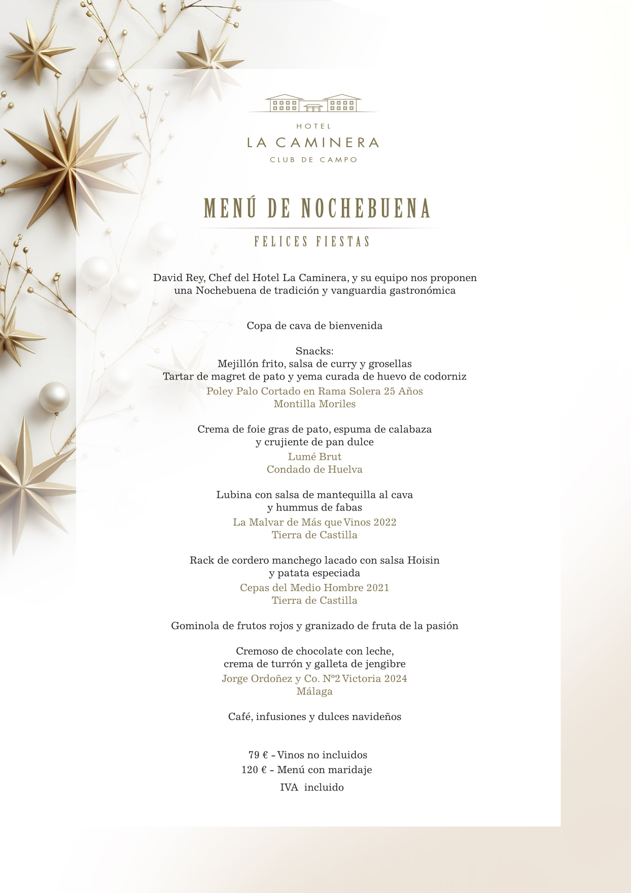 - Precio por persona sin maridaje: 79.-Euros